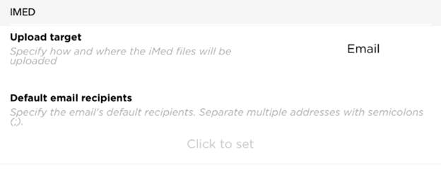 4. Go to the Med section (4th section) and in the ‘’Upload target’’. Choose according to your preferences. If required, enter the necessary information. If using email, make sure an email account is setup on the device. Applications like Gmail or Outlook will not work. If using email, a default recipient can be entered.